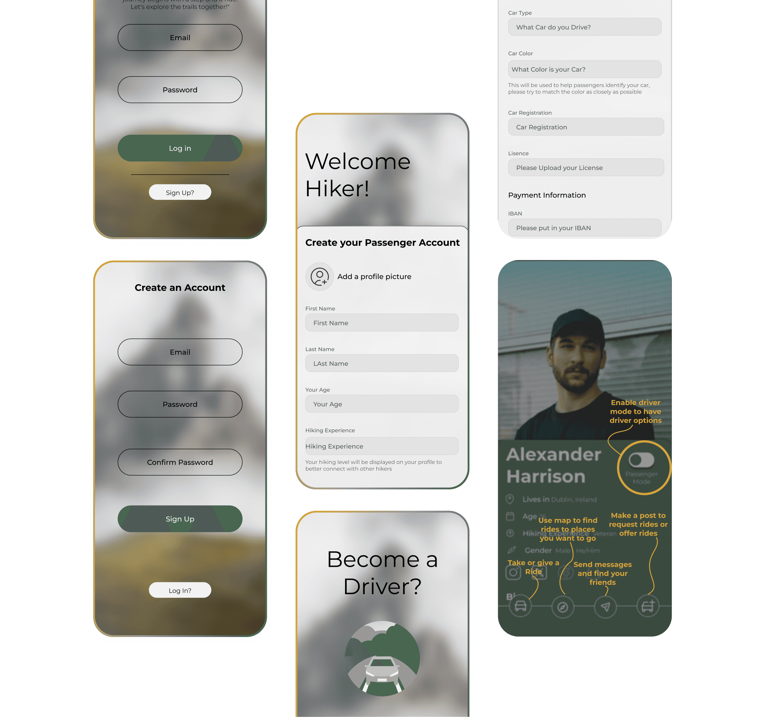 This is my first UI/UX project Ever, I put a lot of effort into it, for a first project, I think it came out pretty well! Trail-Share is a mobile app that connects hikers with drivers, making outdoor travel more accessible. Users can offer or request rides, communicate through the app, and plan trips based on shared destinations. The design emphasizes trust, safety, and a clean, user-friendly experience.