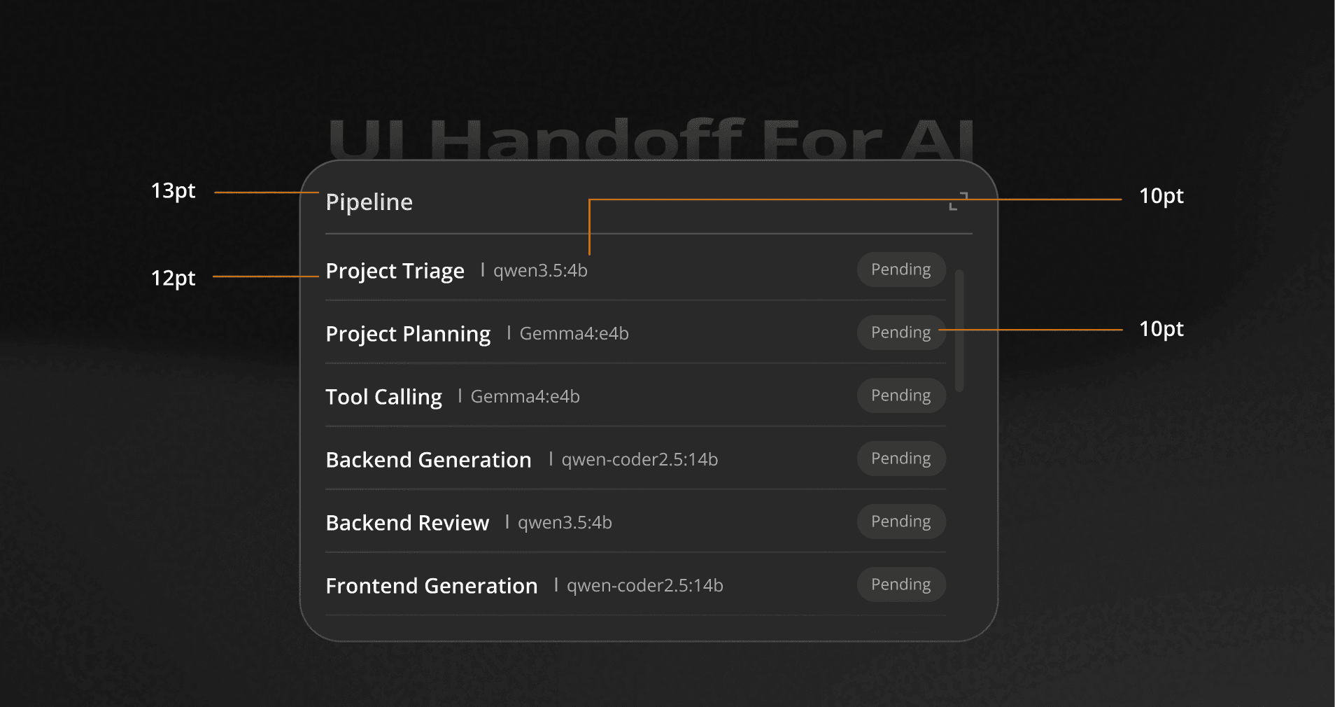 A custom AI workspace that simulates a multi-role development pipeline built with AI and designed in Figma. This project explores backend concepts like guardrails, pipelines, fallbacks, and failure logging, translating these technical concepts into an intuitive UX. The project offers a way to more deeply understand how local AI systems behave in practice, and how to develop a UI that make complex systems usable for non-technical users.